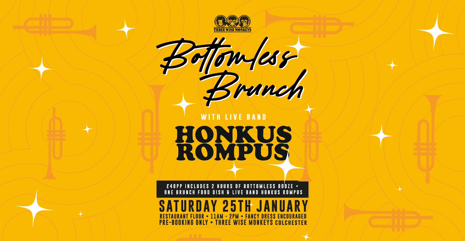 Three Wise Monkeys Colchester presents our Bottomless Brunch with LIVE band Honkus Rompus, the most dynamic cover band in town!