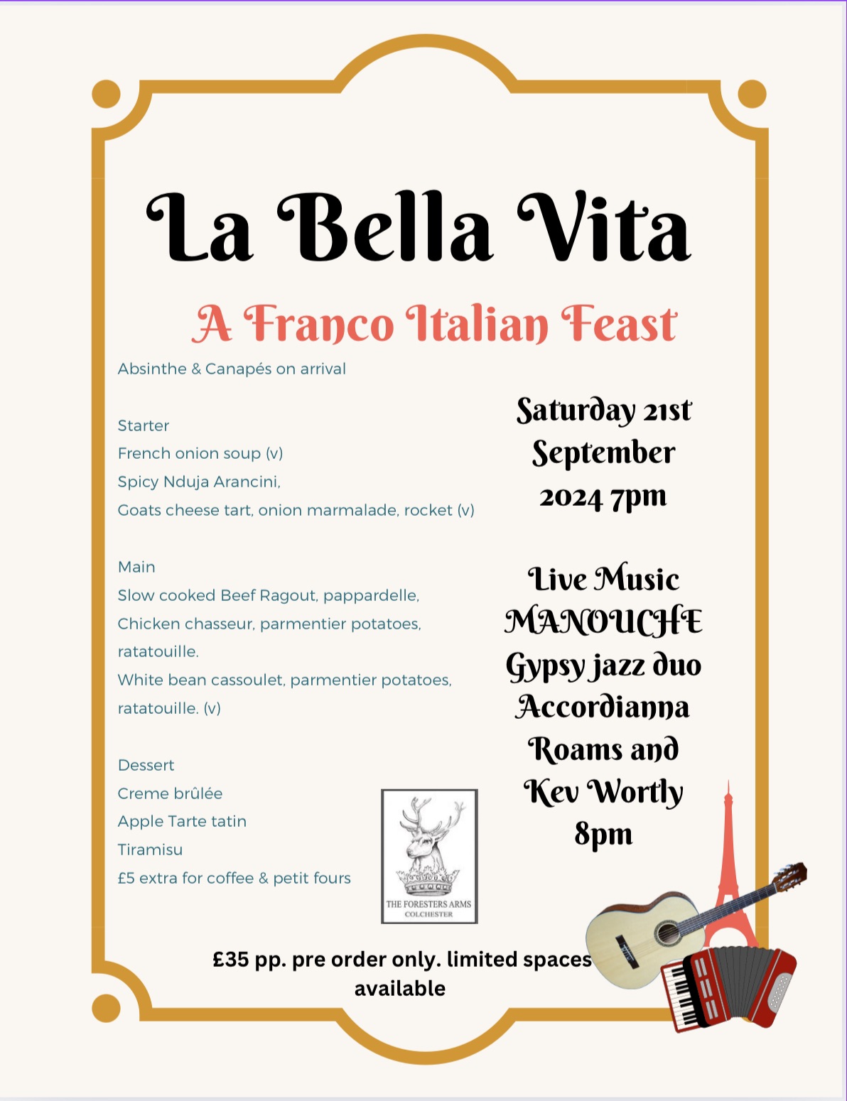 Join us for an enchanting evening of Franco-Italian cuisine paired with live Gypsy Jazz from Accordianna Roams and Kev Wortley.