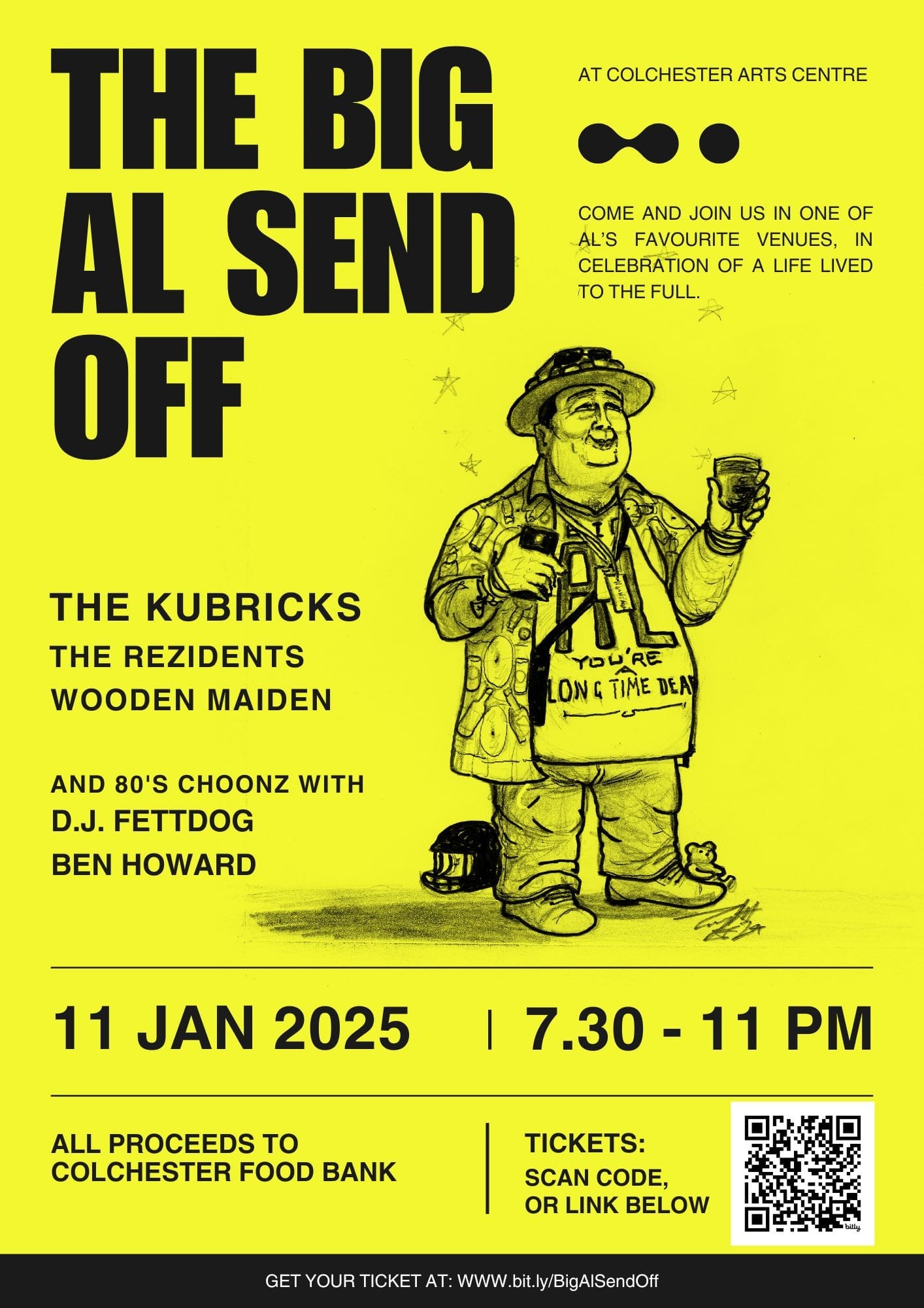 Al was a great supporter of our local community, particularly the Charity, Colchester Food Bank and all profits from the evening will be going to support the work they do. With the generous help of the Arts Centre, musicians, volunteers and 'the Vic', we hope to raise a really worthwhile sum for the charity in Al’s name.